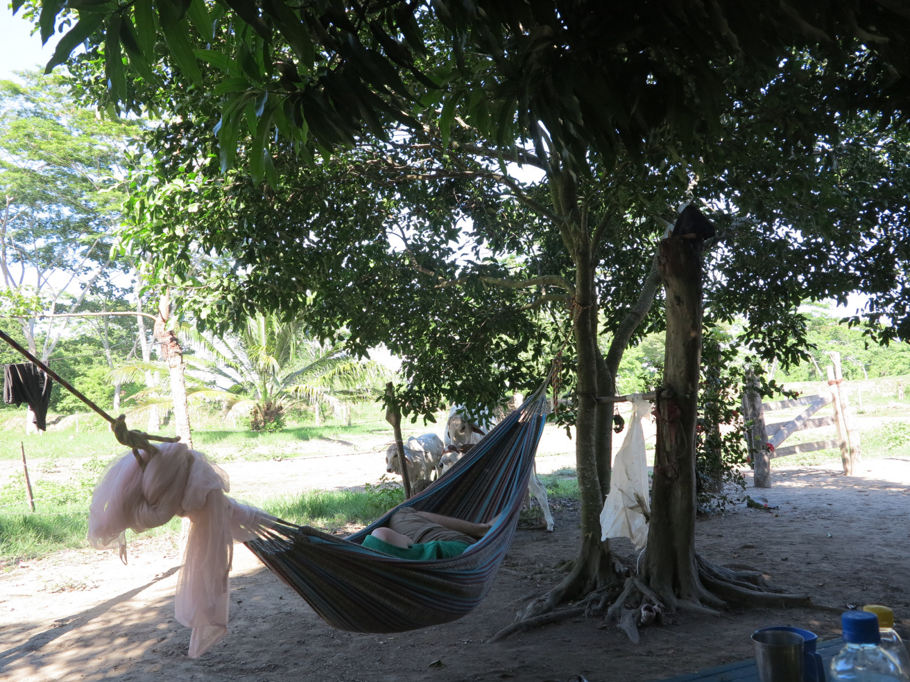 Chacun de nous transporte un hamac et une moustiquaire dans son sac, que nous suspendons le soir pour dormir, attachant la moustiquaire tout autour et la faisant tenir à l’aide de deux bouts de bois aux extrémités. L’étape clé de toute cette entreprise est de rentrer dans son hamac en se glissant par le trou de la moustiquaire en ayant toutes ses affaires pour la nuit dans les mains, s’asseoir sans tout écraser, déchausser ses tongs en les laissant tomber à un point stratégique afin de les retrouver plus tard sans avoir à crapahuter désespérément en agitant un bras pour les attraper, puis vite refermer le noeud sans laisser les nuisibles saisir cette si belle occasion de se faufiler à l’intérieur. Tout ceci fait qu’on y réfléchit à deux fois avant d’aller aux toilettes pendant la nuit. Mais on dort merveilleusement bien, emballé dans ce cocon soyeux qui se balance au gré des vents, bercé par les bruits de la nature. Si bien qu’il est difficile de se réveiller à l’heure décente des campesinos, à savoir 5 heures du matin.