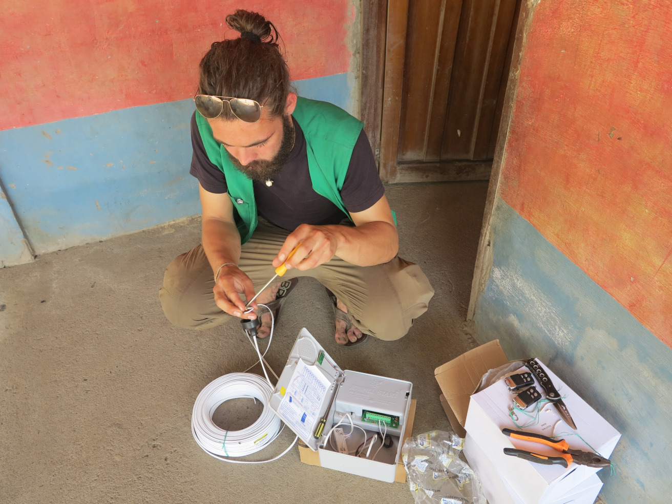 A El Guayabo, Christof et moi aidons à l’installation d’alarmes sonores (enfin, Christof aide), à la distribution de talkie walkie et de lampes frontales. Tout cet équipement est donné par PAS pour la sécurité des campesinos de cette communauté qui subissent des menaces et des attaques fréquentes. Les fincas étant éloignées les unes des autres en-dehors du village, les talkie walkie leur permettraient de communiquer rapidement en cas d’attaques. Les alarmes peuvent s’activer à distance grâce à de petites télécommandes et ont un effet dissuasif sur les agresseurs, mais éveillent aussi l’attention des autres campesinos qui peuvent venir en aide et se rassembler plus rapidement.