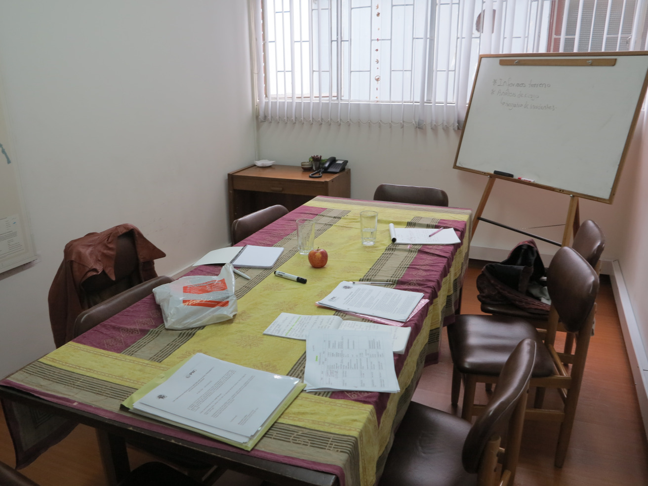 Nous rejoignons le bureau de l’association PAS (Pensamiento y accion social) pour y suivre une formation de plusieurs jours. Alexandra, Betty et Zenaide, toutes trois travaillant pour la défense des droits humains, nous accueillent et nous aident à s’arranger avec les formalités d’entrée et de séjour dans le pays. Eh oui, j’ai une carte d’identité colombienne! C’est peut-être la seule chose qui peut me faire passer pour une bogotana, car ni mon accent râpeux ni la pâleur fantomatique de mon faciès ne sauraient convaincre qui que ce soit, et je ne parle pas de mon sens de l’orientation désespérant dans ce dédale de béton. Nous suivons nos cours avec beaucoup d’attention et en apprenons un peu plus sur le pays, les problématiques générales actuelles et les communautés que nous allons accompagner les trois prochains mois et demi, ainsi que sur notre mission, les protocoles de sécurité, la logistique une fois sur place, etc.