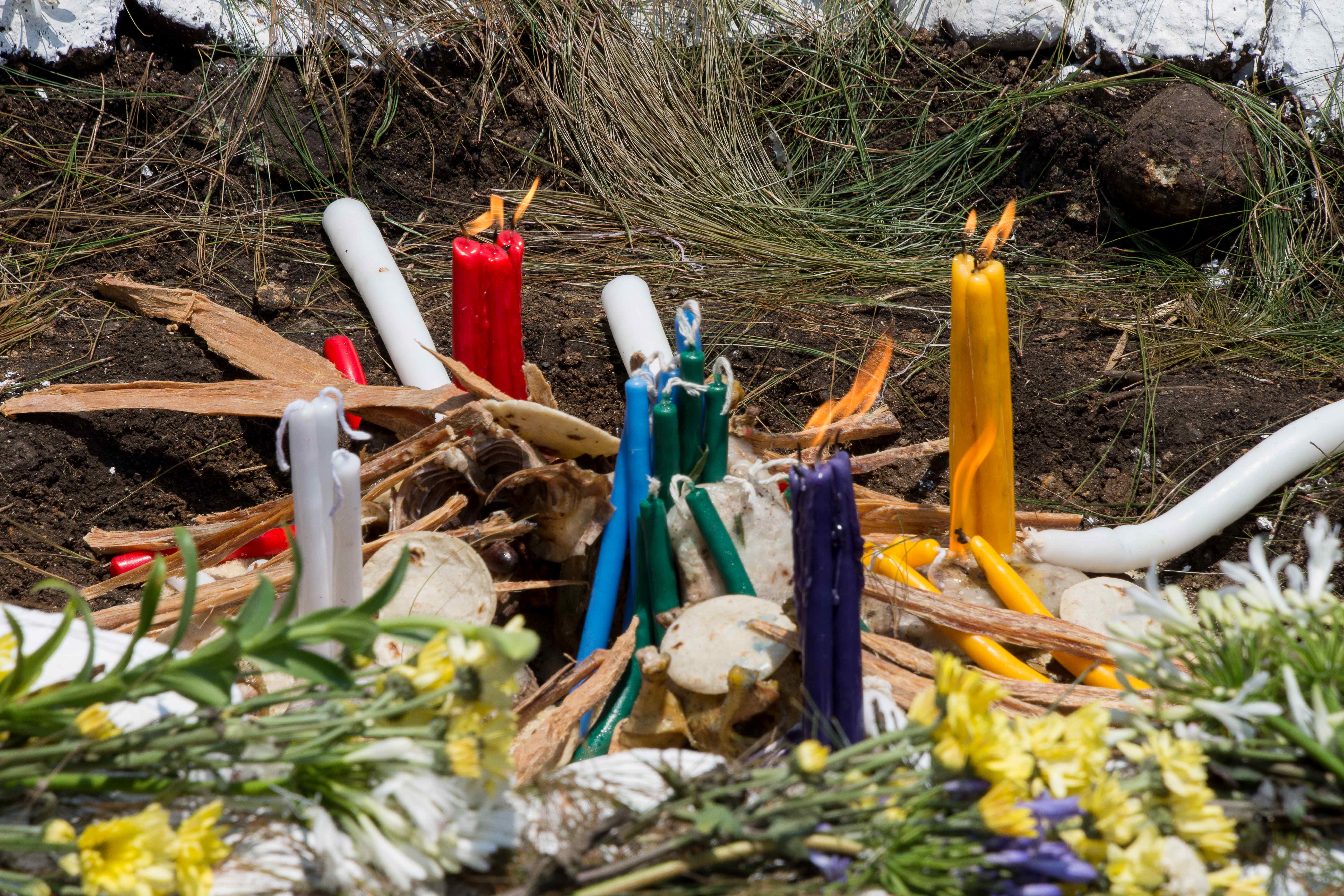 Die Farben der Kerzen bedeuten: Grün und Blau in der Mitte: Wasser und Erde, Weiss=Norden, Gelb=Süden, Rot=Osten und Schwarz oder Dunkellila=Westen. So richten sich gegen Schluss auch die gemeinsamen Gebete in alle vier Himmelrichtungen. Seit das Feuer entzündet wurde und die Gaben langsam verbrennen – die Ältesten legten unter Gebeten zwischendurch immer wieder neue Kerzen und Tamalitos ins Feuer –, beobachten wir alle Phasen dieses Feuers und Erinnerungen an traute heimatliche Lagerfeuer in der Natur tauchen bei mir auf. Aber hier ist kein romantisches Lagerfeuer, sondern unter heisser Mittagssonne sind wir eingebunden in den inneren und äusseren Überlebenskampf dieser indigenen Comunidades.[8]