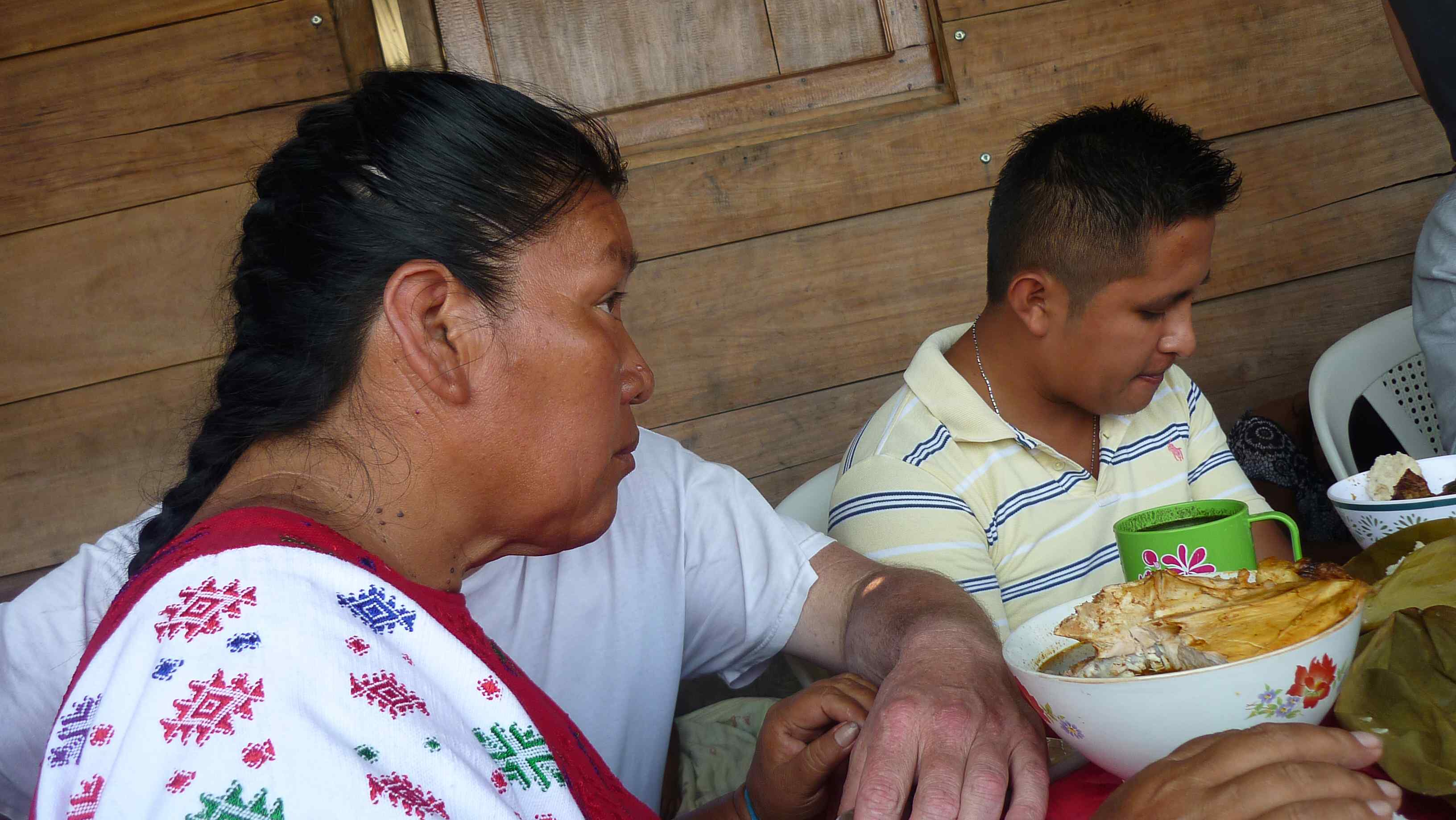 Später sitzen wir alle am gedeckten Tisch: Truthahnfleisch (chompipe, Truthahn/Pfau, gilt als heilig), Tamalitos und ein feines heisses Kakaogetränk mit Copal, einem Gewürz aus Harz, werden serviert. Angélica ist nun wieder ganz die aufmerksame Gastgeberin. German musste sich aus Müdigkeit schon etwas früher verabschieden mit seiner Frau. Unvergesslich bleibt mir, wie er damals am 6. April, nachdem er die Tränen der Enttäuschung über den Urteilsspruch heruntergewürgt hatte, im Microbus seine Begleiter und Begleiterinnen verabschiedete: «Wir dürfen uns nicht entmutigen lassen und nicht aufgeben. Es ist unser aller Kampf um Recht und Gerechtigkeit!», sagte er zuerst in Q’eqchi und dann auf Spanisch. Und: «Vielen, vielen Dank euch allen!» Er steht – auch von uns Acos ungewollt! – ein wenig im Schatten von Angélica Choc, welche international bekannt ist und mit der er sehr verbunden ist. Ob die beiden zusammen mit den Frauen von Lote 8 vor dem kanadischen Gericht noch Recht bekommen werden? Wir hoffen es sehr. Der Kampf für die Madre Tierra und ihre Töchter und Söhne betrifft uns alle. Der Urteilsspruch wird daher wegweisend sein.