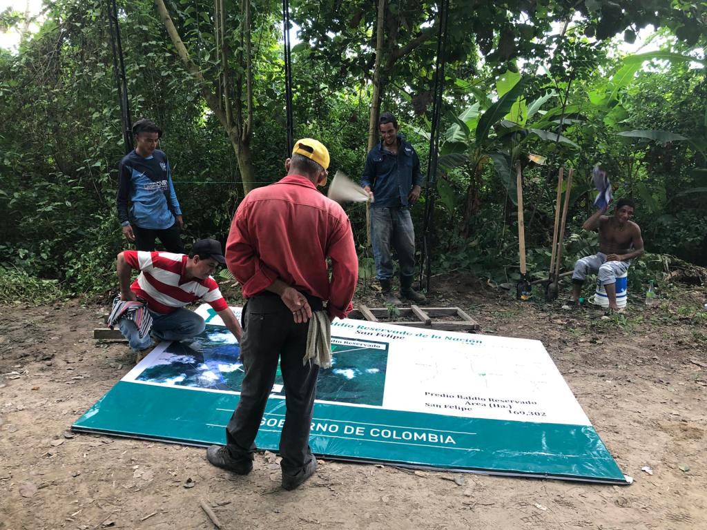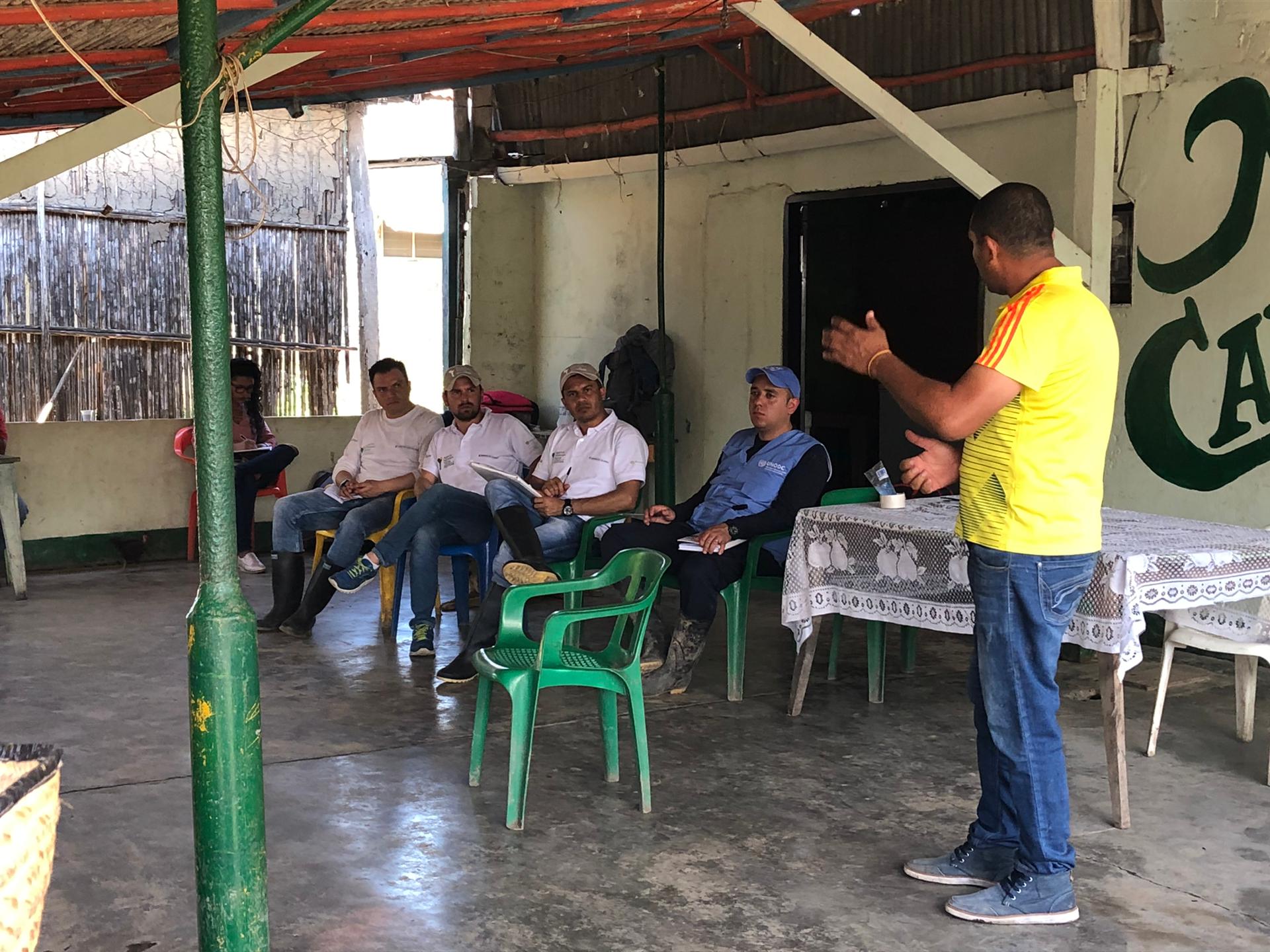 Am nächsten Tag um 10 Uhr stehen die betroffenen Campesin@s im Dorfzentrum für die ersten Informationen bereit. Die Comunidades bekommen neben unserer Begleitung auch von der Comisión Interlocusión, einem Verein der Region, und ihrer Anwältin Angela* Unterstützung. Die ANT ist mit drei Personen da: einem Anwalt, einem Topografen und einem Ingenieur. Sie werden von einem Abgeordneten der UNODC (Oficina de las Naciones Unidas contra la Droga y el Delito) begleitet. Eine weitere Person soll sicherstellen, dass die ANT ihre Arbeit korrekt ausführt.