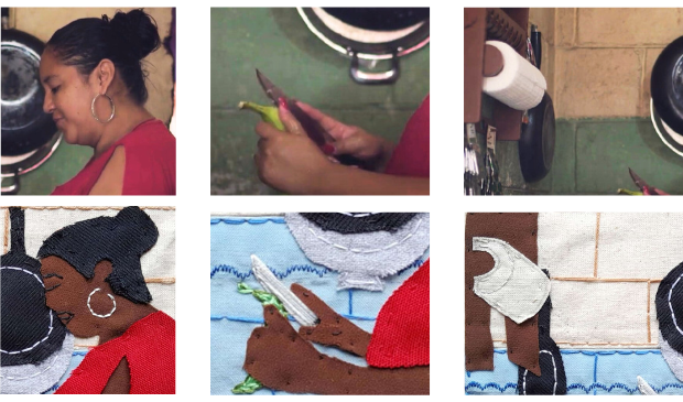 En esta pieza arpillera se representa uno de los fotogramas del documental, en el que la hermana de Vicky prepara la sopa. Elegí este momento por la forma en que, considero, se entrelazan los platos típicos con las resistencias: la comida tradicional es un elemento que siempre está presente en la colectividad; en los festejos y en las ollas o cocinas comunitarias de los plantones y las marchas.