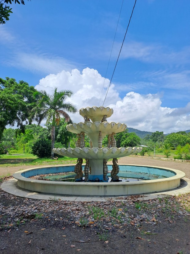 Etwa 20 Minuten westlich der Stadt Trujillo, im Norden an der honduranischen Karibikküste, fahren wir auf ein grosses Tor zu, an dem die schwarz-grün-gelb-rote OFRANEH[1] Flagge hängt. Es wird von jungen Garifuna Männern bewacht. Als sie uns erkennen, öffnen sie das Vorhängeschloss, begrüssen uns grinsend und lassen uns passieren. An einem Schild “Bienvenidos a Campo del Mar” vorbei, fahren wir auf der Zufahrtsstrasse einem kitschigen, mit überdimensionierten Seepferdchen geschmückten Springbrunnen ohne Wasser entgegen. Hier verzweigt sich die Kiesstrasse, wir folgen dem Weg Richtung Küste. Die mit Naturmaterialien gedeckten Sonnenschirme am Traumstrand sind zwar schon ziemlich verwittert, erinnern aber dennoch an die luxuriösen Zeiten als kanadische und US-amerikanische Kreuzfahrttouristen das Resort besuchten. Direkt am weissen Sandstrand mit Blick auf das türkisblaue Meer liegt das Herzstück des ehemaligen Tourismuskomplex “Campo del Mar” – ein Restaurant, eine Bar und der Aufenthaltsbereich mit zwei Pools.