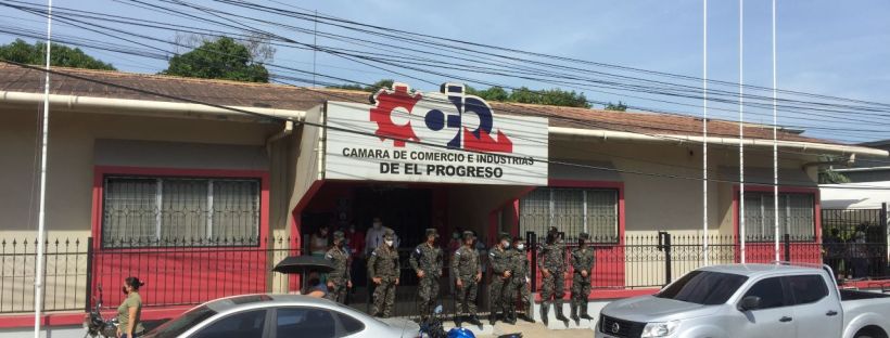 Leyenda: Militares hondureños protegiendo la cámara de comercio durante una manifestación de campesinos en El Progreso, Yoro